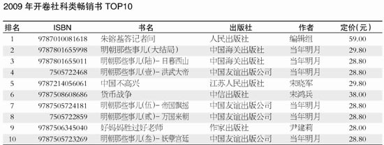 参看2009年开卷社科类畅销书TOP10(见上表),除了独占鳌头的《朱镕基答记者问》让人眼前一亮,“明朝那些事儿”系列占据了榜单10个名额中的6个。由于社会科学板块类别广泛,读者群体相对比较小众而且稳定,纵观2009年人文社科书的出版,尽管市场竞争依旧激烈,出版的单品量也在不断增长,但是整体而言还是延续了不温不火、稳健发展的态势。