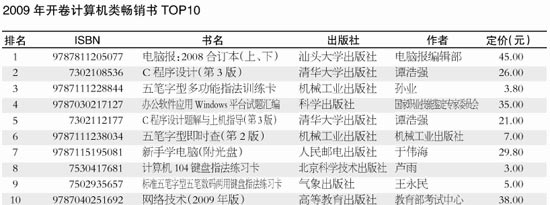 从开卷2009年计算机畅销书排行榜(见表)来看,除了《电脑报》合订本继续保持每年的热销外,2009年,程序设计和考试类计算机图书占据了畅销书排行榜的主力位置,在当当网、卓越亚马逊网上书店的计算机类畅销书榜上,这两类图书也长期位居前列。